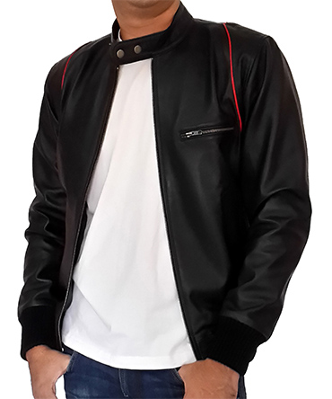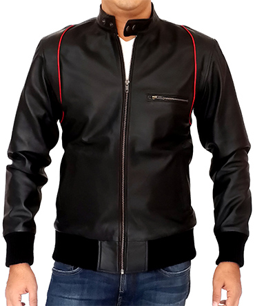Men`s Black Leather Jacket Red Stripe